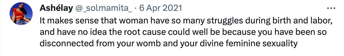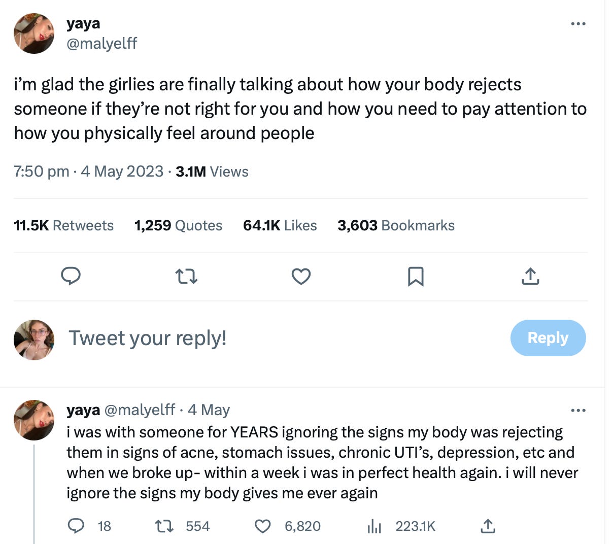 Particularly worrying to me is the shift in how (cis) women online talk about women’s health and menstruation. One common thread on Twitter is the suggestion that if you suffer from UTIs, bacterial vaginosis, or yeast infections during a committed heterosexual relationship, then your body is rejecting your partner by sending a spiritual signal.2 A sexual partner’s infidelity or personal hygiene can impact your vaginal health, but this isn’t your body rejecting them — though if this is the root cause, maybe you should be. Yet self-help coaches and spiritual counsellors on social media have turned this biological reaction with no bearing on the emotional status of a relationship into a determining sign from an all-powerful universe.