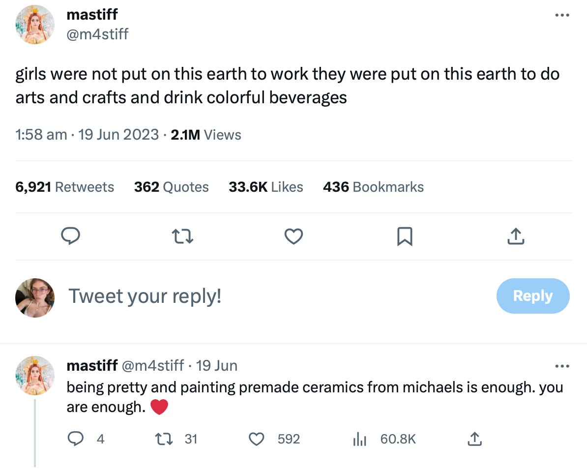 It’s not just stay at home momfluencers and alternative medicine practitioners suggesting that women’s bodies make them unfit for work. Younger women, who faced the exhausting demands of girlboss feminism and then saw its demise as reactionary politics became the norm, are also turning back towards the home, albeit with a dose of Gen Z irony. With hypergamy the buzzword of the moment, the traditional path of sexual and financial dependence is re-gaining popularity. Whole swathes of the internet are devoted to teaching young women how to find a rich husband, or preaching the value of a dependent life. ‘girls were not put on this earth to work they were put on this earth to do arts and crafts and drink colorful beverages’ reads one tweet with 33.6k likes, whilst the ‘acting dumb in [rich area] to find a husband’ trend has thousands of contributions.5 A step on from hypergamy, other influencers are suggesting that sex work is the only way for women to truly connect with their divine feminine energy outside of marriage.